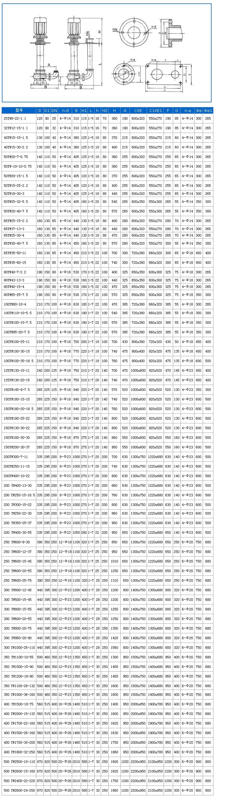 四、YW型液下式無堵塞排污泵性能參數(shù)選型表