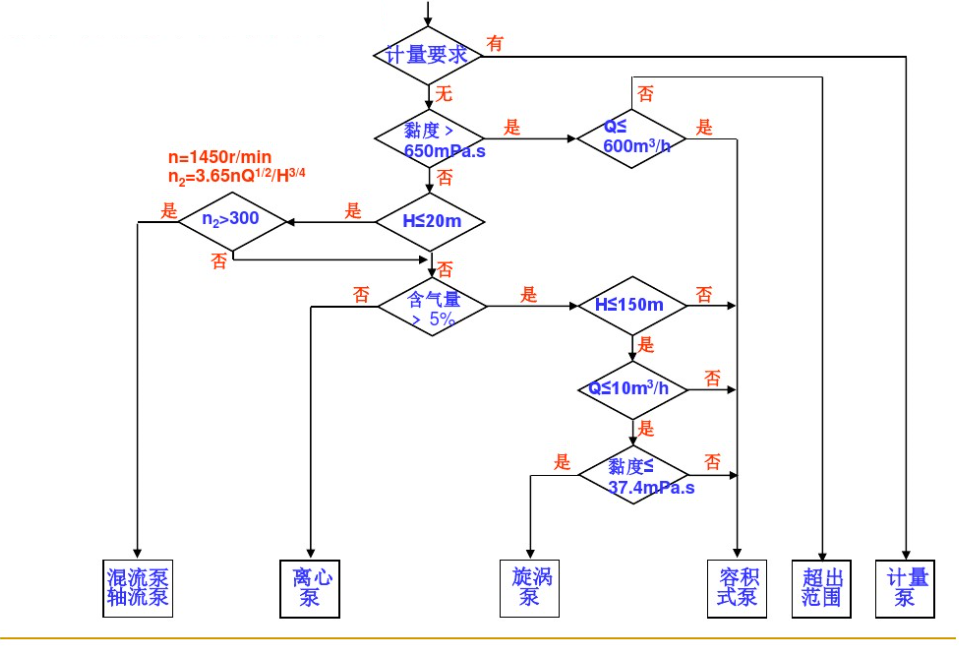 水泵的類型應根據裝置的工藝參數、輸送介質的物理和化學性質、操作周期和泵的結構特性等因素合理選擇。圖1-2為泵類型選擇框圖,可供選型時參考。根據該框圖可以初步確定符合裝置參數和介質特性要求的泵類型。離心泵具有結構簡單、輸液無脈動、流量調節簡單 等優點,因此除以下情況外,應盡可能選用離心泵。